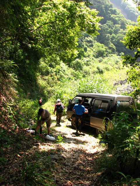 由台14線翠峰接力行產業道路,接到力行約產道約21K處,右轉續走力行產業道路,到了翠巒附近,問了當地人,走捷徑到翠巒支線,過了翠巒分校後路陡且窄(一般車子建議不要續往下開),後段甚至雜草蔓生淹沒路徑,幸小林大哥開車技術優異,我們還是一路往下開,一直開到崩塌處才停車。