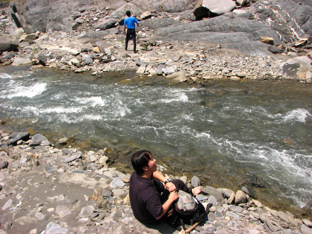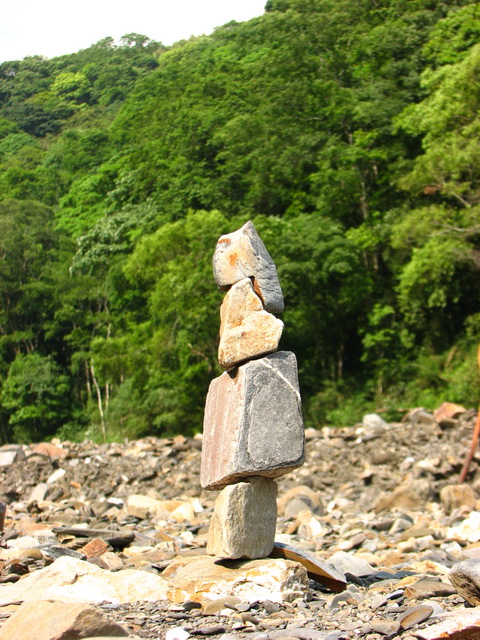 1501 下到溪邊,脫鞋過溪,順便玩一下疊石